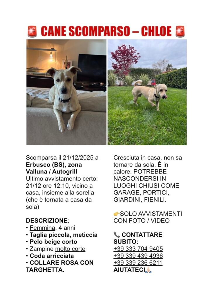 Chloe ha 4 anni ed è scappata di casa il 21/12/2025 ad Erbusco, zona Valluna-Autogrill (campo da calcio). Essendo cresciuta in casa non è in grado di tornare da sola o di stare in giro così a lungo. È una meticcia di piccola taglia, con pelo beige raso. Ha delle zampine molto corte e una […]