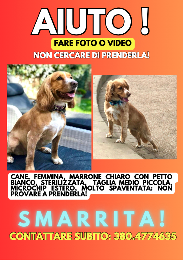 CANE, FEMMINA, MARRONE CHIARO CON PETTO BIANCO, STERILIZZATA, TAGLIA MEDIO PICCOLA, MICROCHIP ESTERO, MOLTO SPAVENTATA: NON PROVARE A PRENDERLA! […]