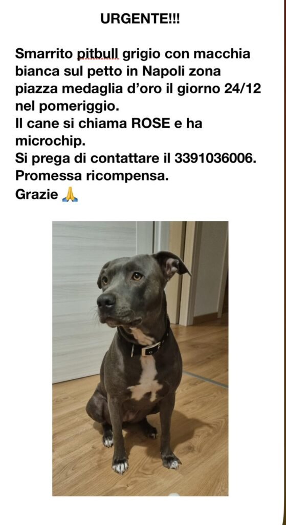 💕💕🐕 ROSE È TORNATA A CASA 🎈🏡🎉 Smarrito in zona Vomero Arenella pitbull femmina di nome Rose. Il cane ha 3 anni e mezzo di colore grigio e con macchia ampia bianca sul petto. E' microcippata nella regione Piemonte ma smarrito a Napoli. Ha una rara allergia alimentare per cui necessita di continue cure. Si […]